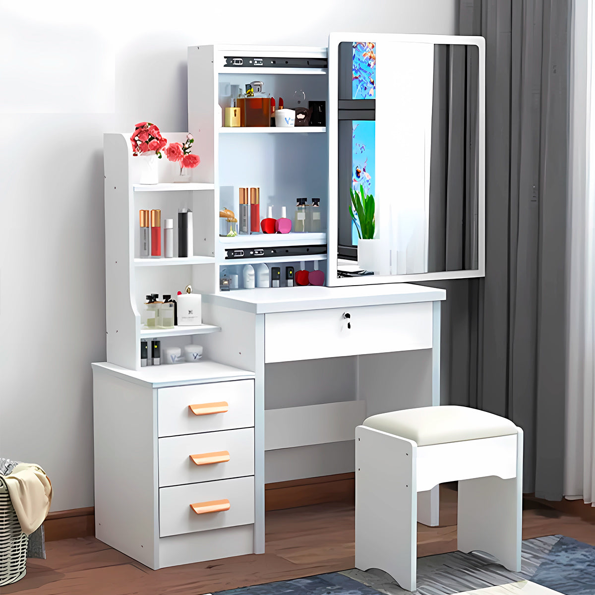'Este elegante tocador de maquillaje con cuatro cajones y un amplio espejo está diseñado para quienes buscan un equilibrio perfecto entre funcionalidad y estilo. Los cajones ofrecen un espacio amplio para mantener tus cosméticos, herramientas de belleza y accesorios organizados y accesibles, mientras el espejo permite una visión clara y precisa para perfeccionar tu look diario. Su diseño sofisticado lo convierte en una pieza decorativa que realza cualquier habitación, combinando elegancia y practicidad. Incluye un cómodo sillón acolchado, que te permite disfrutar de largos momentos de preparación con total confort. Su estructura ergonómica y materiales suaves proporcionan la comodidad necesaria para que tu rutina de belleza sea una experiencia relajante. Este tocador es el complemento ideal para crear un rincón exclusivo en tu hogar, donde belleza, orden y estilo se unen de manera impecable.' *Las imágenes son referenciales *Diseño es sujeto a stock